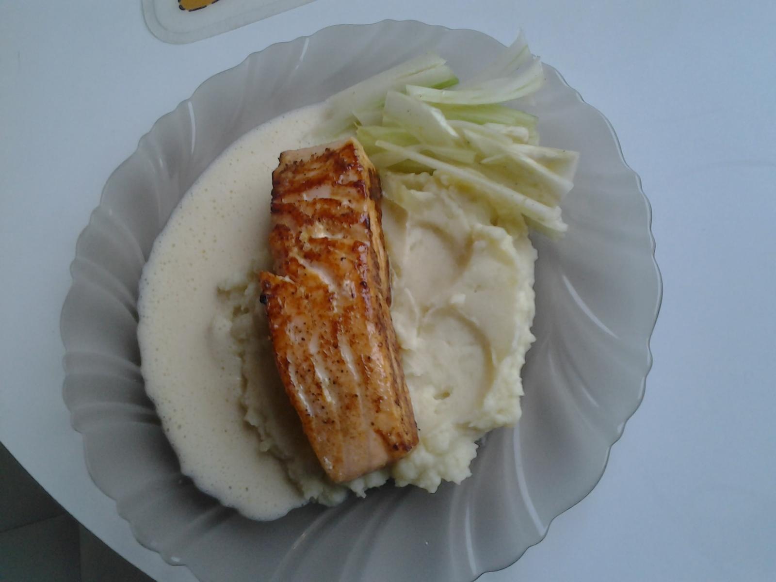 losos marinovany v pomarancoch na masle, zemiakovo zelerova kasa, citronova omacka a fenyklovy salat.