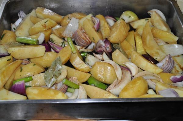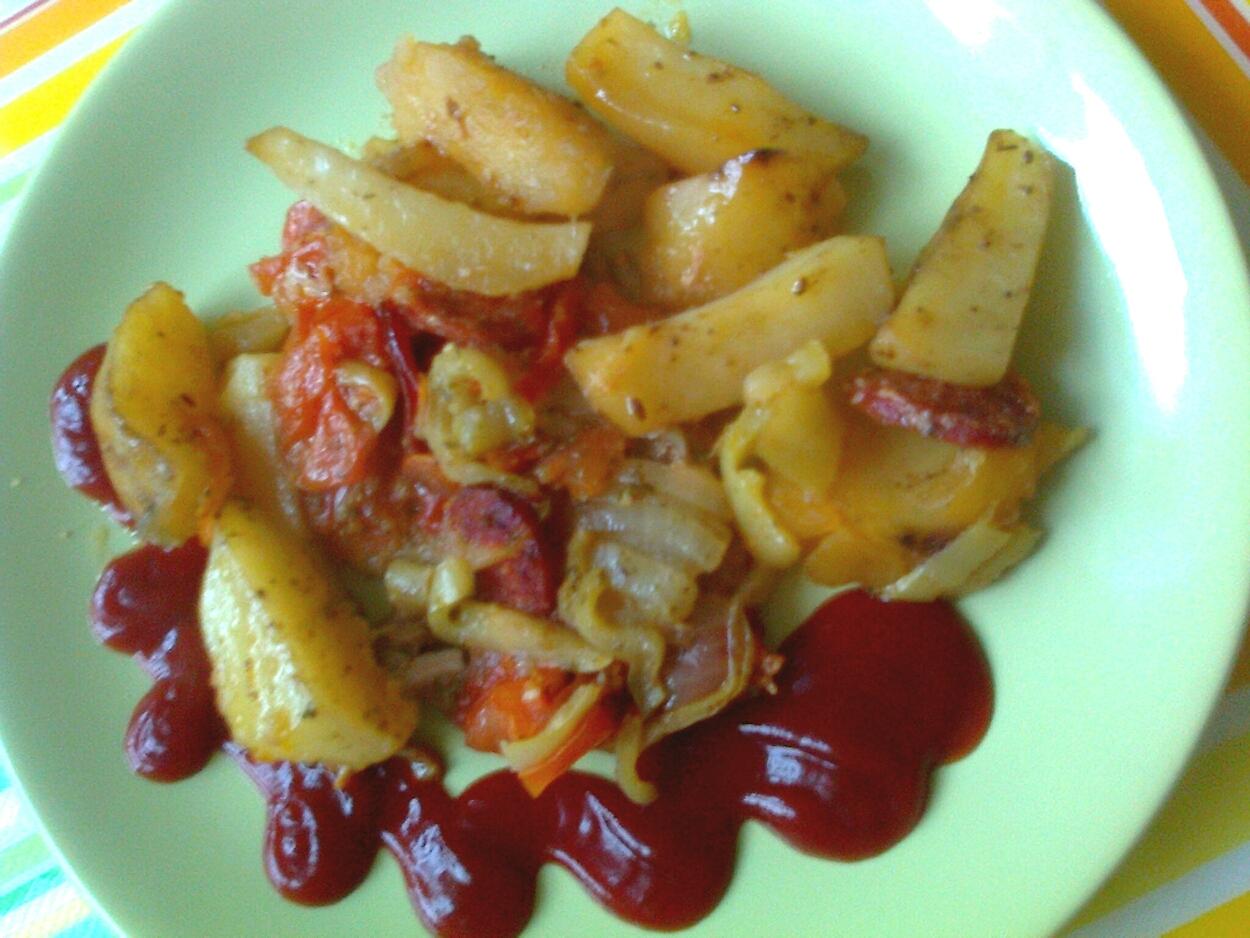 My dnes zemiaky s maskom,paradajka,paprika,cibula,cesnak,klobaska v jednom pekaci,zajtra gulasova pol.a lievance.