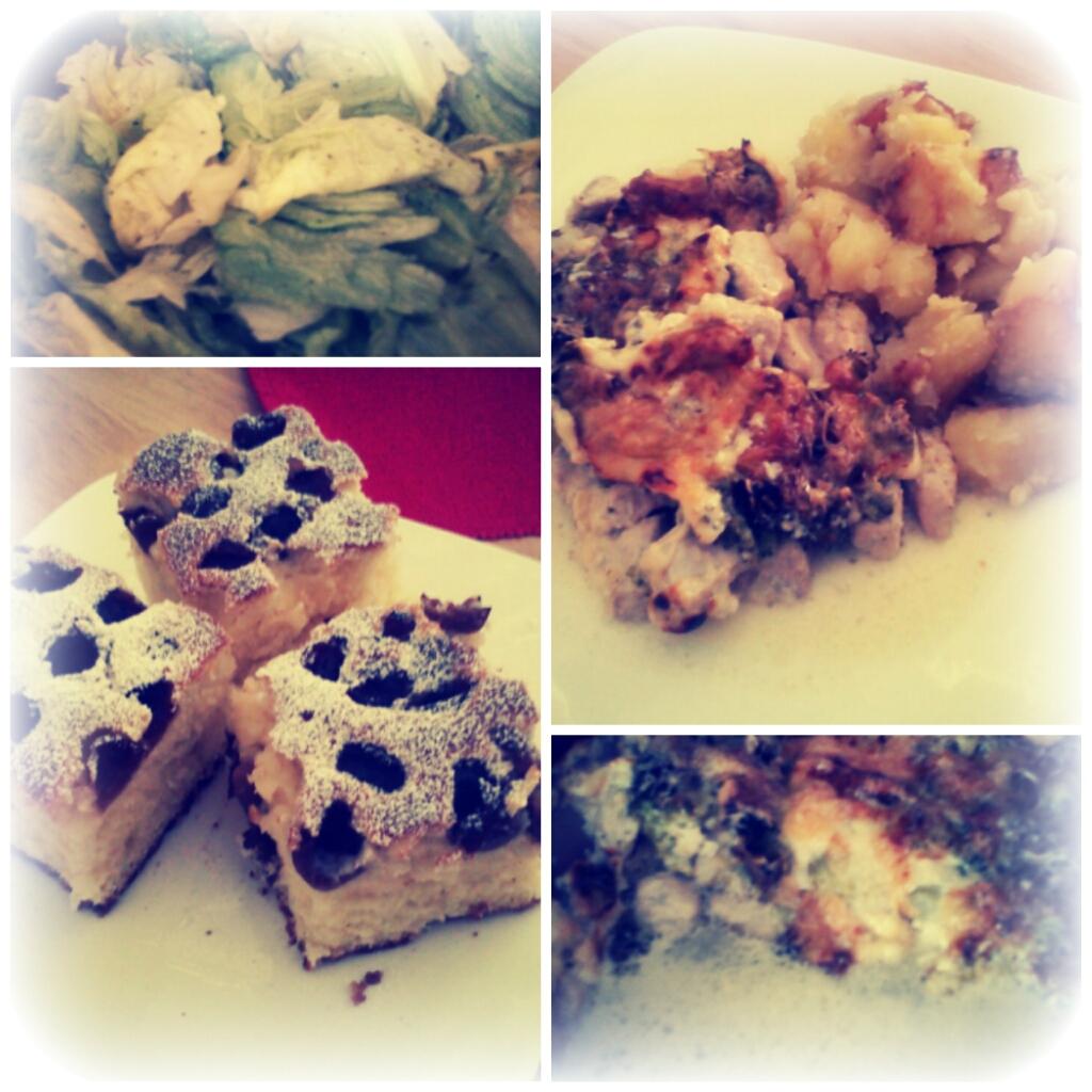 slepacia polievka s rezancami,mlety rezen zo syrom,zemiakova kasa a kapustovo-mrkvovy salat,rychly jablkovy kolac s citronovou polevou,ten som piekla vcera 🙂