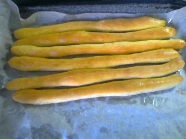 Zo 100 ml teplého mlieka, droždia a 1 ČL cukru si urobíme kvások, necháme asi 5-10 minút vykysnúť. Do misky si dáme múku, 1 PL oleja, štipku soli, 2 žĺtka a zvyšok mlieka a vykysnutý kvások. Ja som najprv cesto prepracovala elektrickým šľahačom a potom ručne. Cesto by malo byť vláčne a nemao by sa lepiť. Takže ja som musela pridávať po troškách múku. Cesto som nechala 30 minút odpočívať. Potom som si na pomúčenej doske vyvaľkala rukami šúľance. Tie som ukladala na plech vyložený papierom na pečenie. Papier treba troška potrieť olivovým olejom, aby sa štangle neprilepili. Piekla som na 250 stupňov asi 10 minút a hneď po vybratí z rúry som ich potrela olivovým olejom zmiešaným s 1 prelisovaným strúčikom cesnaku. Štangle sme si namáčali do cesnakového dresingu. 3 PL kyslej smotany, 1 PL bambina, soľ, štipka vegety a 4 prelisované strúčiky cesnaku. Dobrú chuť