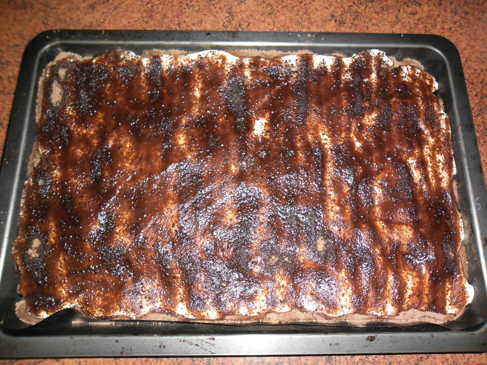 Nejprve uvařte z mléka, cukru a vanilkového pudinkového prášku standardním způsobem pudink. Bude světlý, takže piškot musí být tmavý. Ušlehejte vejce s oběma cukry(případně samotné žloutky a z bílků vytvořte sníh, ten vmíchejte do těsta až jako poslední), do pěny zašlehejte horkou vodu a olej, a jakmile náležitě zhoustne, zapravte do ní směs mouky s kypřicím práškem a kakaem. Vymíchejte řidší tmavé těsto, nalijte ho a rozetřete na plech s pečicím papírem. V této fázi naložte do těsta polévkovou lžící řady oddělených kopečků světlého pudinku - jeden vedle druhého (jako ovoce na bublaninu). Zůstanou na hnědé hladině, ale v průběhu pečení se ponoří. Takto připravený základ vložte do trouby vyhřáté na 180 stupňů a pečte ho asi 20-25 minut - podle vlastní trouby. Po vychladnutí potřete plát na plechu zakysankami vymíchanými s cukrem. Povrch uhlaďte a posypte silnou vrstvou granka. Dezert pak nechte v lednici několik hodin (nejlépe však přes noc) odležet.