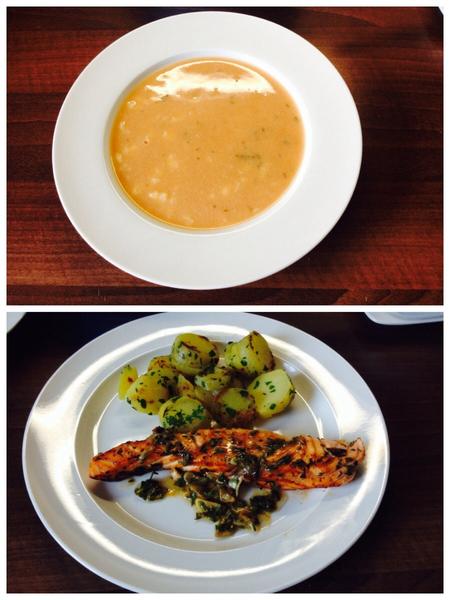 Dnes milánska polievka a losos so zemiakmi, k tomu zeleninový šalát. Na foto nič moc, ale losos bol vynikajúci.