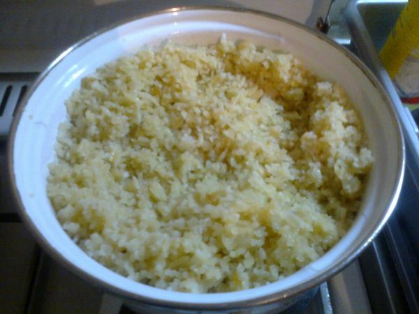 Vývar z kostí, dusená ryža, vyprážané bravčové rezne, kyslá uhorka.