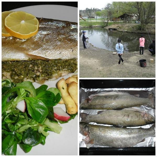 ahojte ja som včera nevarila boli sme na celodennom výlete na ranči kde sme si nachytali rybky- pstruhov tak som mala hned inšpiráciu čo dnes varit 😉 ako každú nedelu slepačí vyvar so zeleninkou, slížikmi, pečených pstruhov plnených pestom z medvedieho cesnaku, hranolky, zelerové hranolky, šalát polníček s redkovkou ,medvedím cesnakom a upiekla som koláčik černoškine prsia 😉