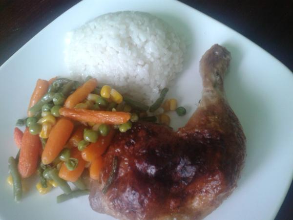 U nás dnes klasika pečené kuriatko s ryžou a k tomu slivkový kompót.