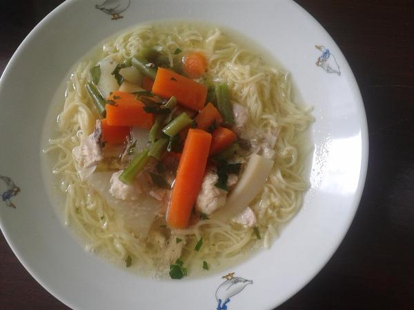 V sobotu sme mali krupičkovú polievku s brokolicou a rozšľahaným vajíčkom, knedľu a segedínsky guláš, dnes u nás zeleninová polievka s ovsennými vločkami, pečené kuracie stehná, zemiaková kaša a grilovaná cuketa 😉