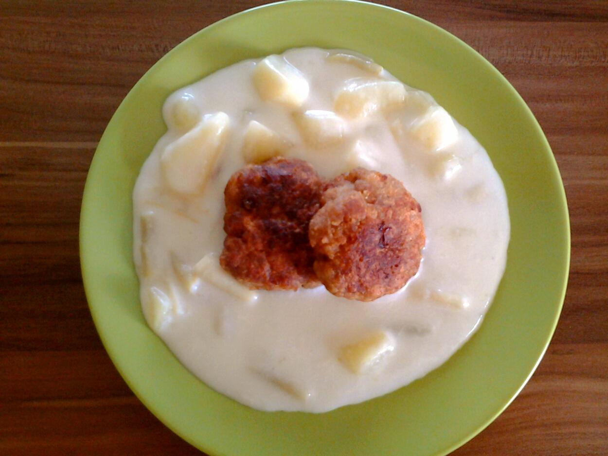 Dnes hraskovo zemiakova polievka s haluskami a granadir s kyslou uhorkou