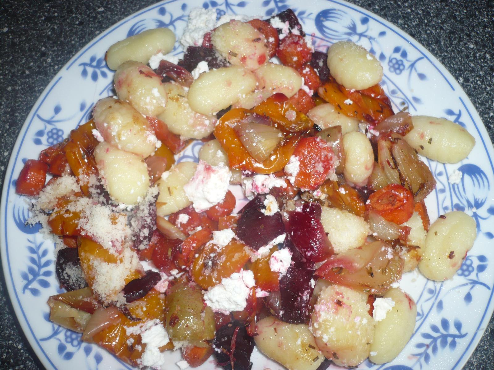 Kedze deti maju gastritidu tak zaprazena krupicna polievocka a na druhe kuracie kusky vo velkom mnozstve stavy s pazitkou a cibulovymi cibikami kvoli farbe a chuti (nestazuje to travenie) + ryza. Sebe som upiekla mrkvu na kruzky s platkami zemiakov a batatami, troska oleja a soli. Velmi prijemne sladke to bolo.