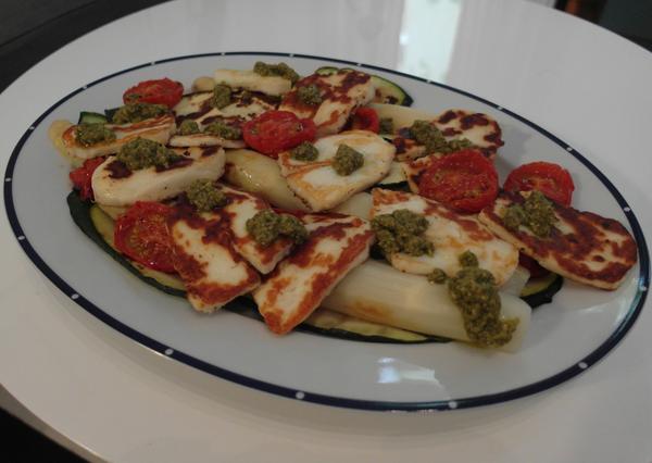 my sme mali na obed šalát zo syra halloumi, špargle, polosušených paradajok a cukety s pestom