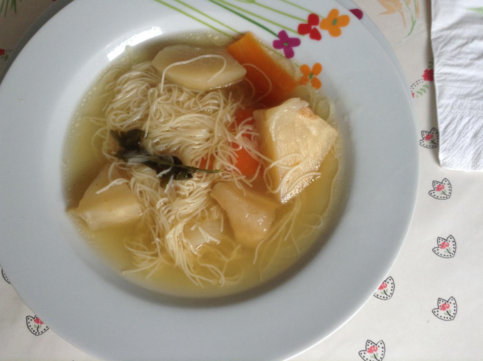 hovadzia polievka s nitovkami, fasirka pecena na plechu, varene zemiaky a kapustovy privarok 😉