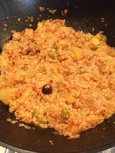Dnes som spravila hrstkovú polievku, a bryndzové z ovčej bryndze. No a z chladničky sa na mňa škerila cuketa a stopkatý zeler, ale nie celý, tak 2/3. Tak som vymyslela panvicu viď foto, bola tam červená cibuľa, na nej som podusila tie vňaťky zo zeleru, reku nech je to čo najzdravšie, jasne olivový olej. Pokrájanú cuketu a všetok zeler na kúsky pokrájané som podusila, soľ, korenie na zeleninu, potom rajcinovú omáčku s olivami "combino" z lidla, dobre som dusila vo voku pod pokrievkou, nakoniec odstavila, dala lyžičku medu, nechala postáť a zmiešala s nachystaným kuskusom.