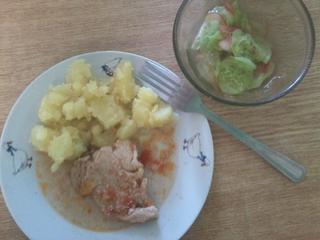 my máme tiež klasiku...zeleninková polievočka, morčacie rezne, zemiakovu kašu a paradajkový šalát 🙂