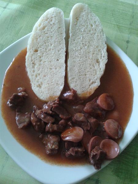 v sobotu a v nedelu sme mali debrecinsky gulas s domacou knedlou a kedze knedla ostala, tak dnes som k nej dorobila rychlu rajcinovu omacku. a ped chvilou som upiekla lupaciky.