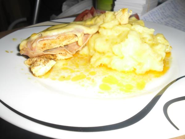 kuracie masko zapekané so salamom a syrom a zemiakové piré a paradajka 🙂