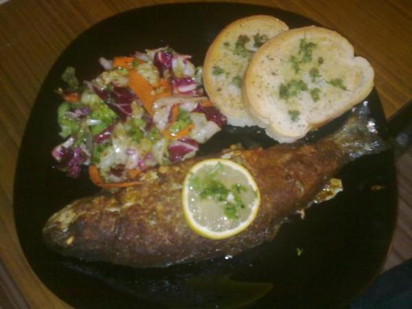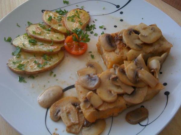 rybka na masle so šampionikami a opekane zemiaky na sucho