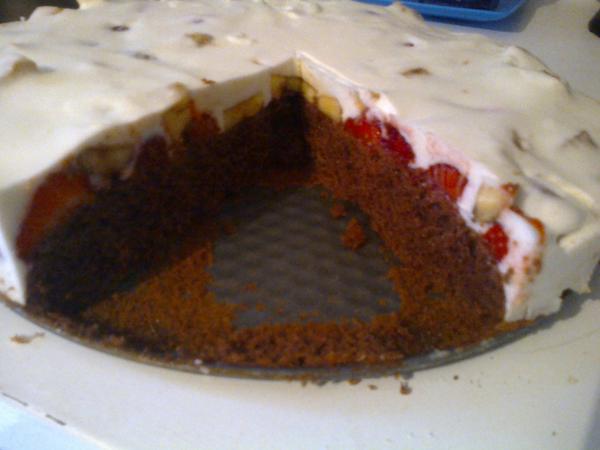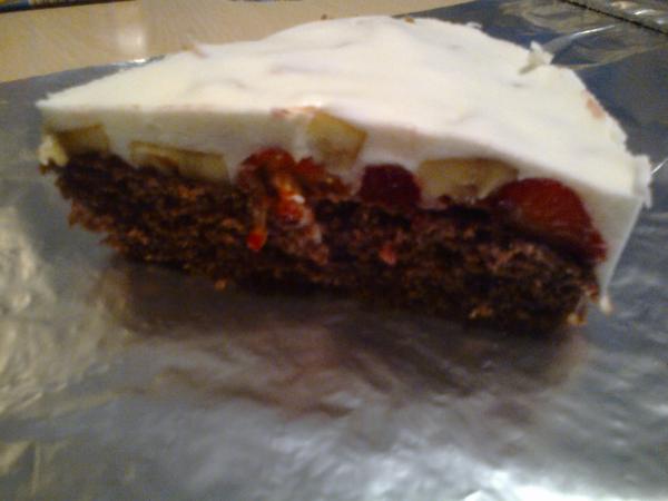 No my sme včera dojedali a dnes sa chystám robiť bravčový perkelt s haluškami. A včera som piekla špaldovú tortu s jahodami a banánom. Na prvej foto je vo fáze robenia, ešte jej chýba krém, na druhej foto už zo stuhnutým krémom a tretia foto je fáza koštovky.