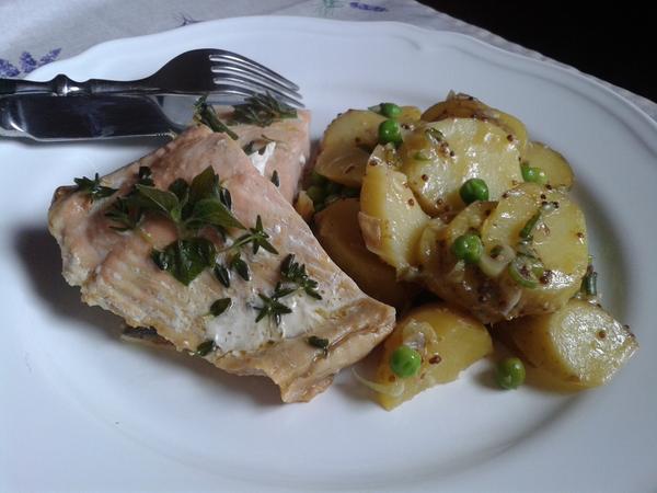 ryba so zemiakovym salatom so zalievkou z medu a hrubozrnnej horcice