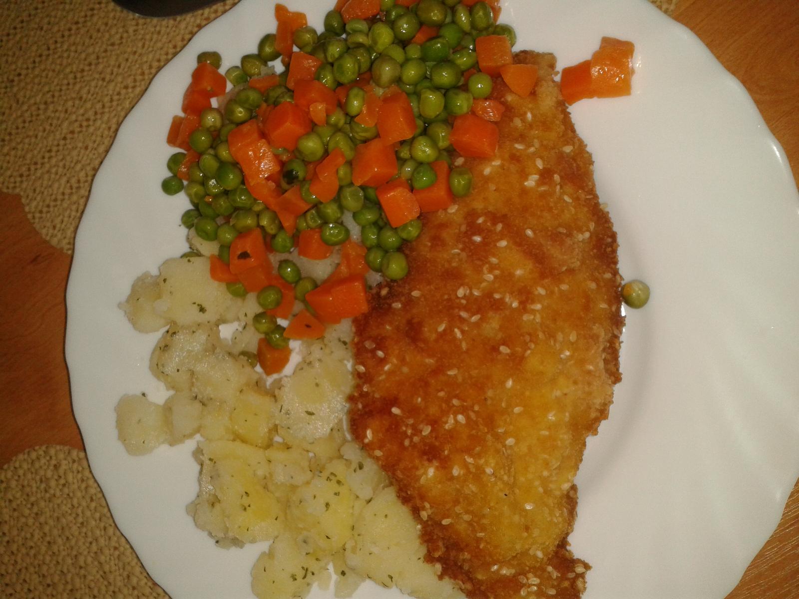 Ahojte, u nás dnes na obed ryba v trojobale a zemiakové pyré, večer som upiekla tvarohový koláč s čerstvými broskyňami.