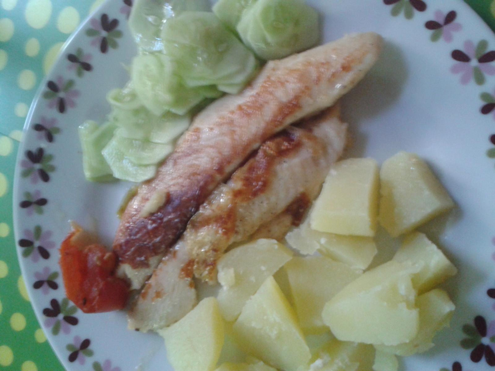u nas "jedalnova klasika" pecienka a slovenska ryza, uhorkovy salat 🙂 ..... po dlhom case a mooooc sme si pochutili 🙂