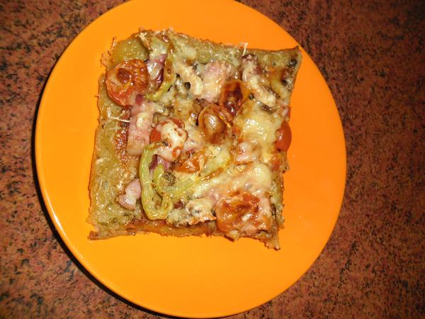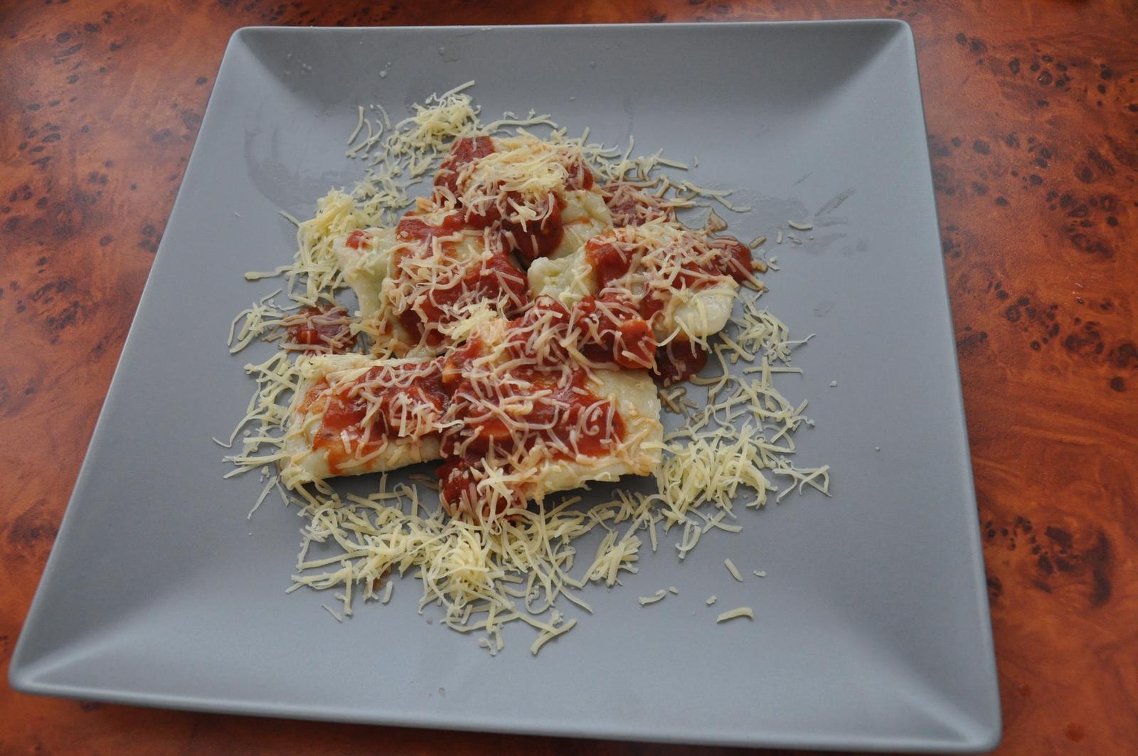 Potom potřeme kečupem nebo protlakem smíchaným s pizza kořením. Poklademe surovinami, které můžeme obměňovat podle vlastní chuti. Nahoru nastrouháme sýr.