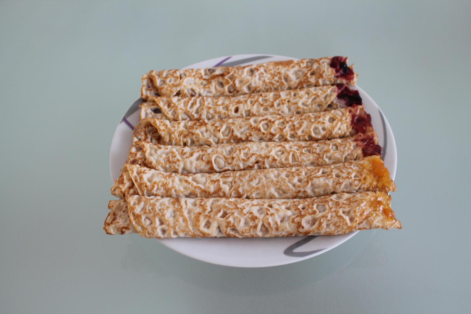 Palacinky z celozrnnej spaldovej muky plnene cucoriedkovym, malinovym a broskynovym dzemom bez rafinovaneho cukru 😎