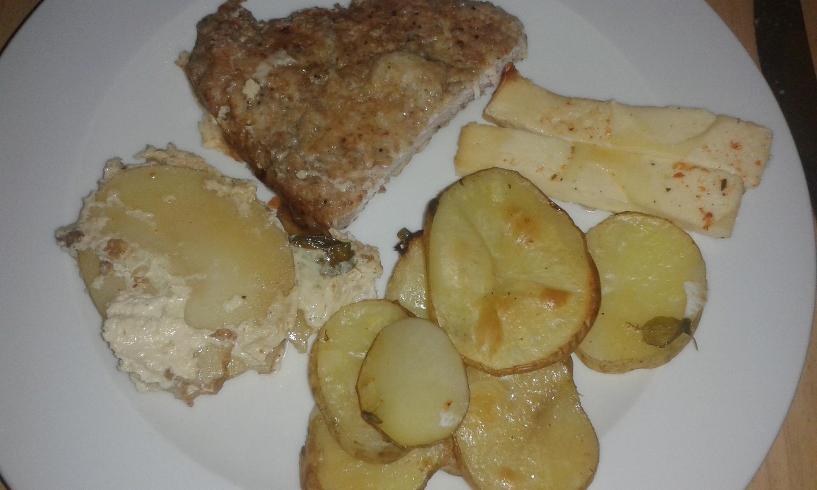 @miasun Kare som nakrajala na platky, naklepala, osolila, okorenila a obalila v muke a rozslahanom vajku. Na rychlo som opiekla na oleji. Zemiaky som nakrajala na platky, osolila a posypala grilovacim korenim a listkami cerstveho oregana. Zapekaciu misu som potrela olejom a vrstvila som zemiaky - opecene masko - platky tvrdeho syra - zemiaky. Ostalo mi trocha vajicka tak som ho rozriedila s mliekom a vyliala na zemiaky. Piekla som zakryte do makka.