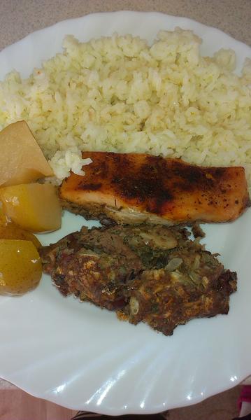 Pečené kuracie stehná s ryžou a marhuľovým kompótom. Polievka nám ešte zostala cesnaková.
