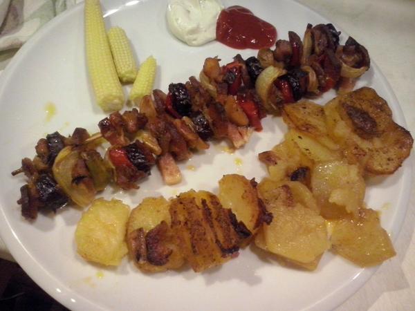 Hovadzia polievka a spizy s kuracim marinovanym maskom (sojova omacka, worcestrova omacka, med, cesnak), zemiackami, cibulkou a slaninkou