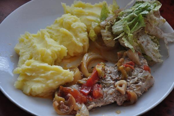dnes rychlovka: zemiakova kasa,opecena telacia pecienka s cibulkou a uhorkovy salat. 🙂