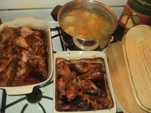 nas obed v obraze, kura vlavo je s cesnakom, vpravo s medom, a uplne vpravo moje nove osatky na pecenie chleba