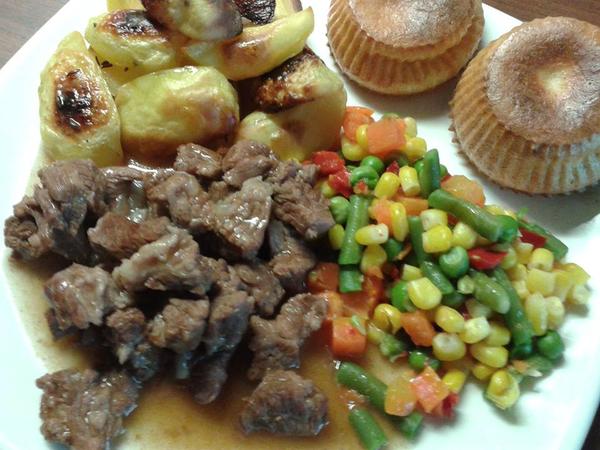 1.dusene hovadzie, yorkshirsky puding, zelenina s maslom, pecene zemiaky