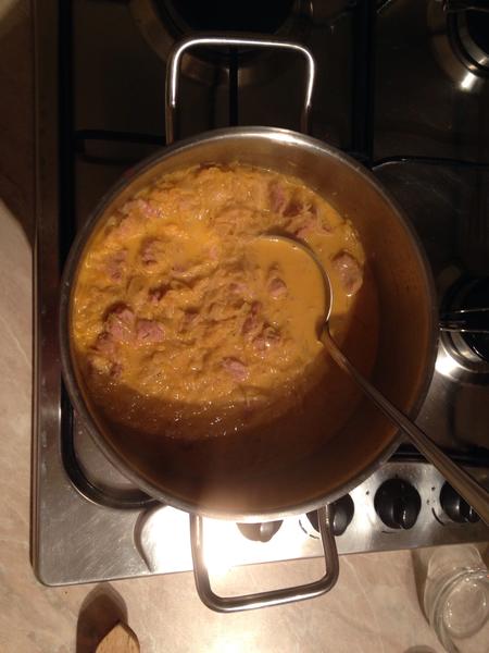 My máme "zelenú polievku". (na hrubo nastrúham kaleráb a pór nakrájam na kolieska, podusím na masle, osolím, ovegetím, zasypem trochou kukuričianky, zalejem vodou, pridám zelený hrášok, zavarím krupicové halušky). K tomu španielske vtáčiky (dnes bravčové, plnené spišskou párkou, vajcom na tvrdo, uhorkou), k tomu výpeková omáčka a tarhoňa. Do toho koláč "brutálnik": makovo orechový bez múky.