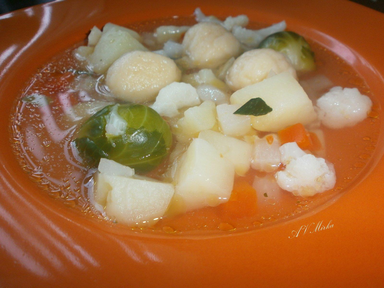 Mixovana polievka (por,mrkva,zemiak) a hlivovy perkelt so zemiakovou kasou.