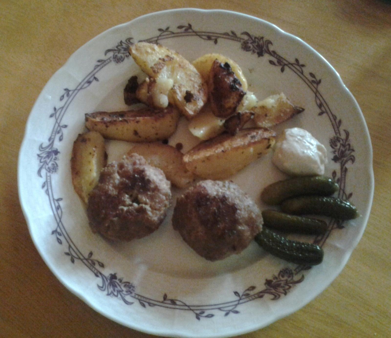 Šampionová krémová polievka, pečené zemiaky, vyprážané bravčové rezne, kyslá uhorka.