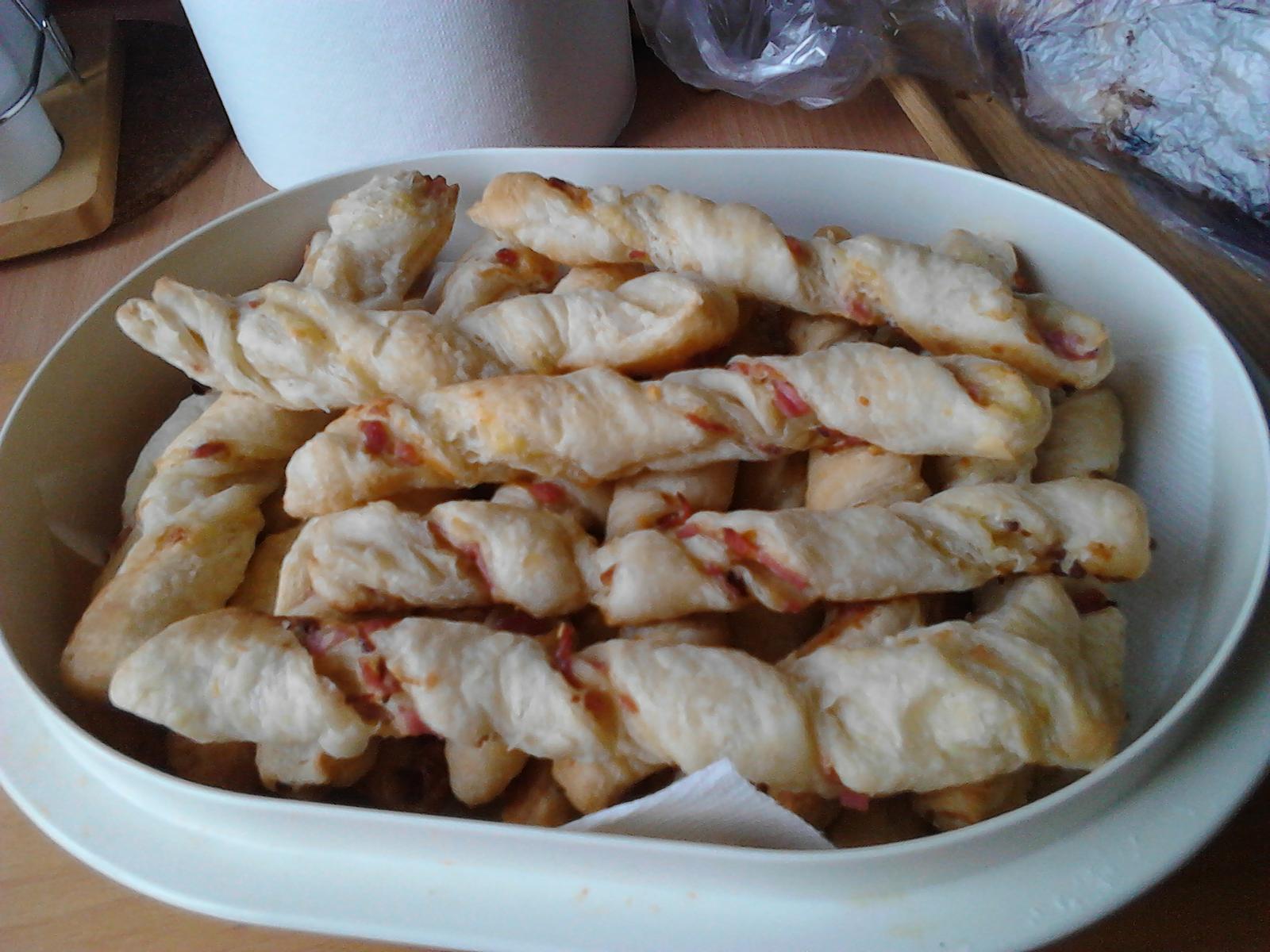 @katkabg ahoj,na slimaky-vyvalkas cesto na tenko,potres kecupom,posypes struhanym syrom,oreganom,poukladas platky sunky,zrolujes ako roladu,pokrajas kolieska.vrch posypes este yrom,zvyknem davat olivu navrch,ale zabudla som kupit...a upecies....palicky-vyvalkat cesto na tenko,potries vajcom,posypat solou,ako mas obdlznik cesta,tak len polku posypes syrom struhanym a davala som n drobno pokrajanu susenu sunku,prelozis cesto a zvalkas este,pokrajas palicky a zmotavas,upecies finito....inak fajne su aj s niva syrom mnaam