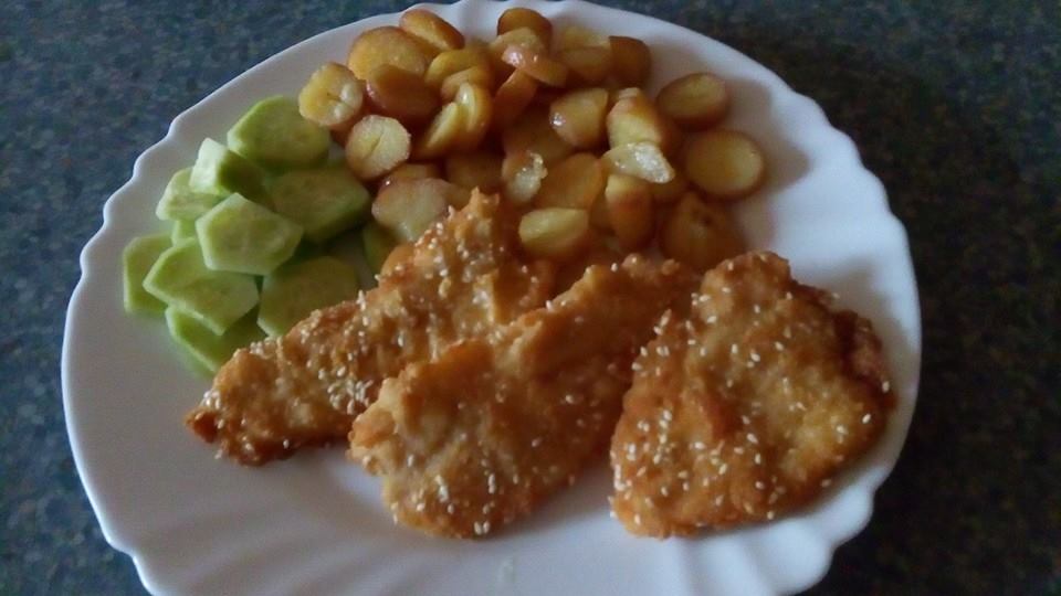 slepačia polievka, kuracie rezne v sézame, ja s pyré, moje lásky s ryžou a skúšam tú nutelovú ružu, no skúšam...muž to pečie s dcérkou 😀 😀 😀