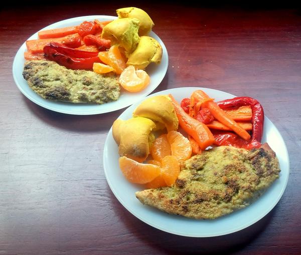 @lenkamarkusova ahoj,sú to opekané zemiaky a kuracie vyprážané prsia v strúhanke so sézamom 🙂