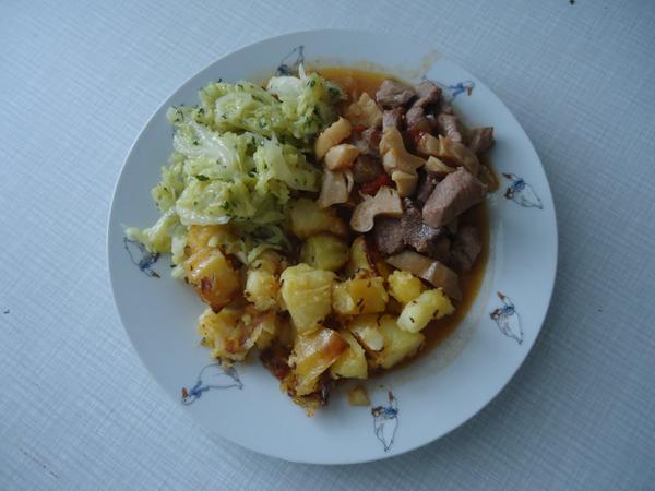 dnes vývar z kostí, dusené bravčové maso s hlivou, pečené zemiaky, restovaný kel - pochúťka s knihy Lidl Paulus vs. Ihnačák.