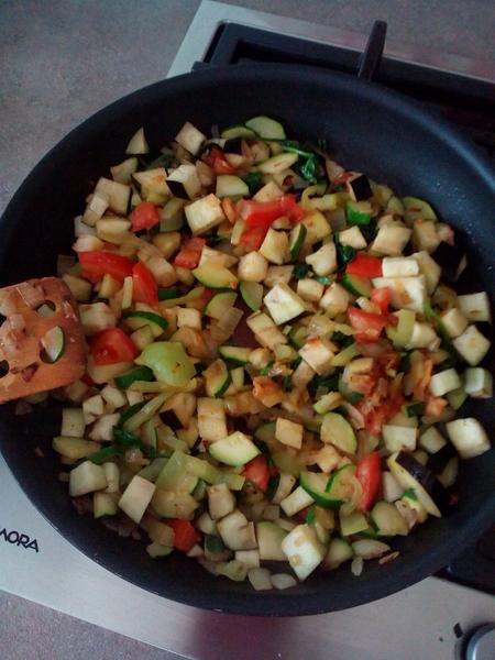 1.na oli oleji som opražila cibuľu, pridala 1 zelenú papriku, 1 cuketu so šupou, 1 paradajku a 1 baklažán (kolieska posolit, po 10 min soľ zmyť). Všetko na drobno pokrájané.