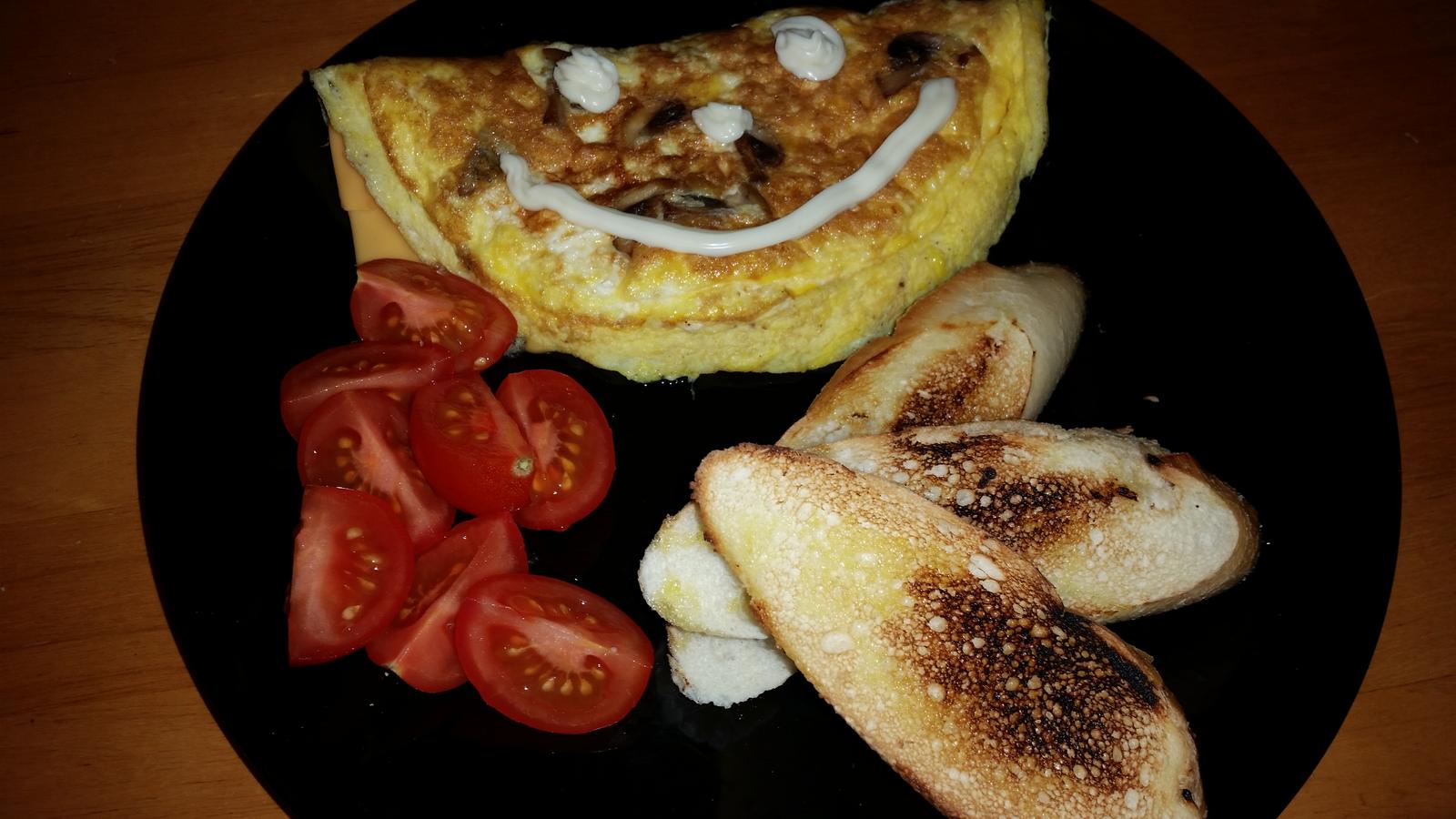 Raňajky-omeleta so šampiňónmi a taveným syrom+bagetky