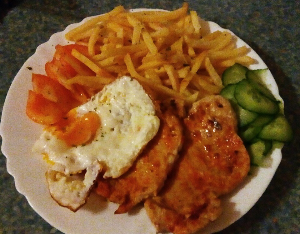 Včera som varila fazulovu polievku s udenym masom, kyslou kapustou so smotanou, k tomu kolienka s vajcom, slaninkou a hlavkovy salat + sisky. A dnes budú kuracie prsia na ananase s ryžou.