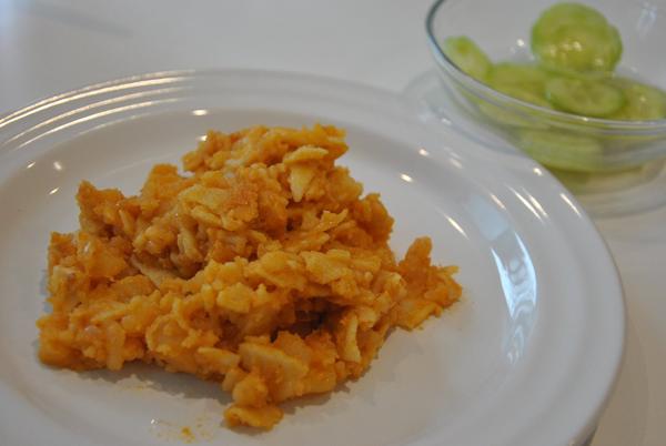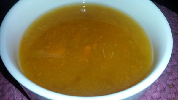 Mrkvovo-zázvorová polievka a zo včera kuracie so sojovymi kockami a zeleninou