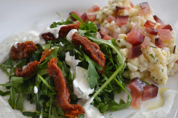naša večera zapekané chlebíky so salámom a plesnivým syrom, kečup 🙂