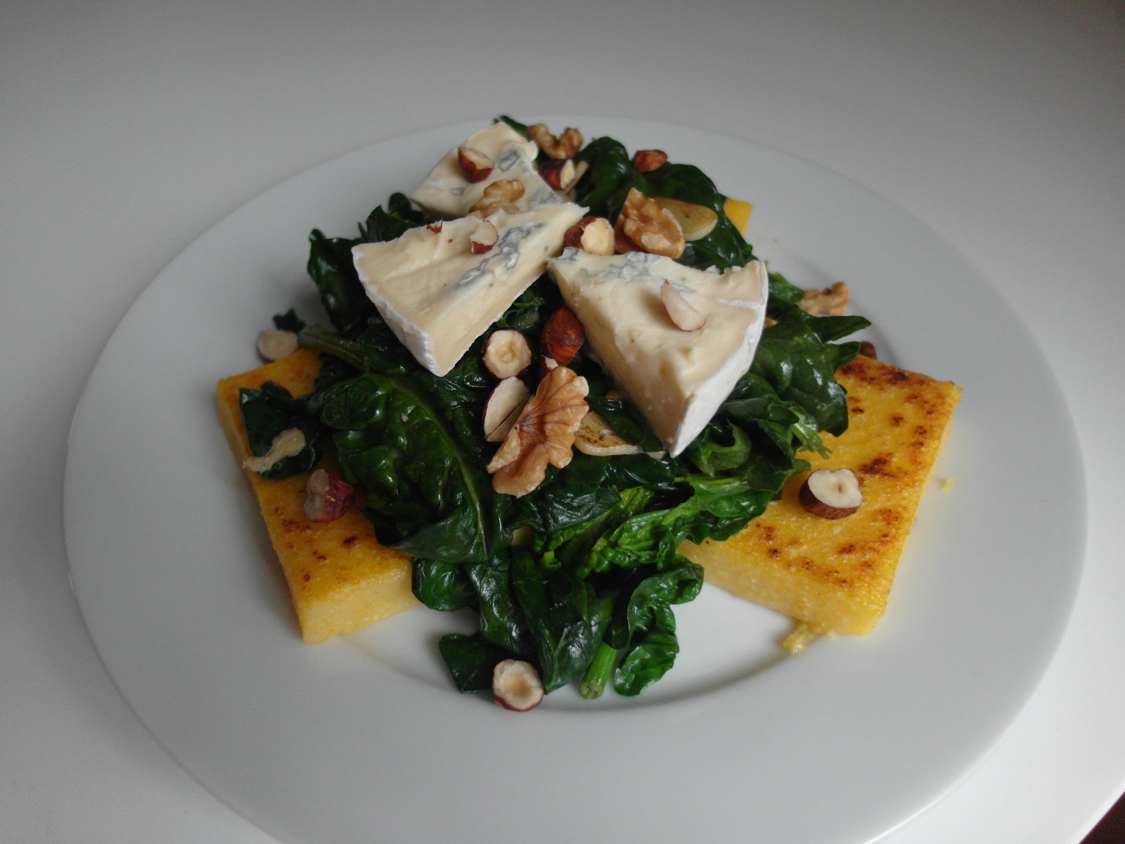 Mali sme skvelú vegetariánsku večeru: grilovaná polenta so špenátom, syrom s modrou plesňou a orechami