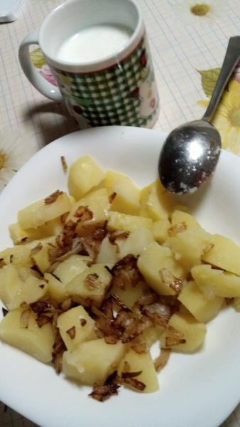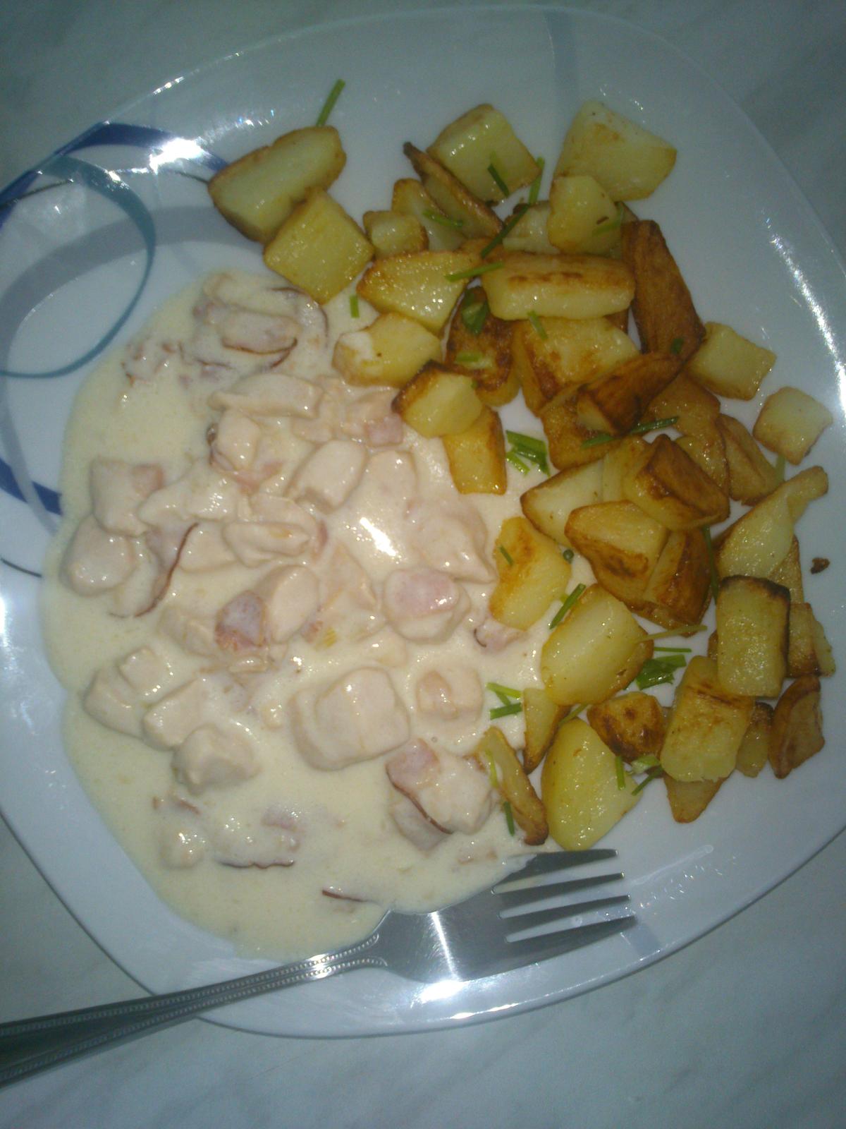 naša večera pečienka na cibuľke, varené zemiaky, uhorka