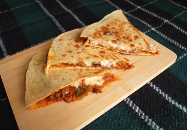 My sme mali včera quesadillas, čiže zapekané tortillové placky plnené syrom a ragú z červenej šošovice a hovädzieho