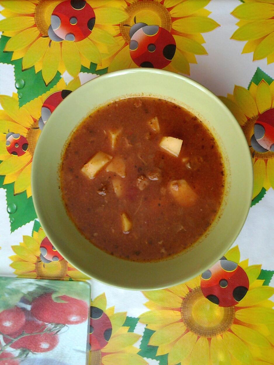 Gulasova polievka a zapecene zemiaky s cuketou a slaninkou.