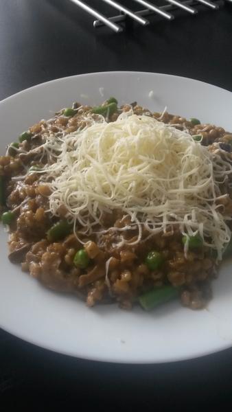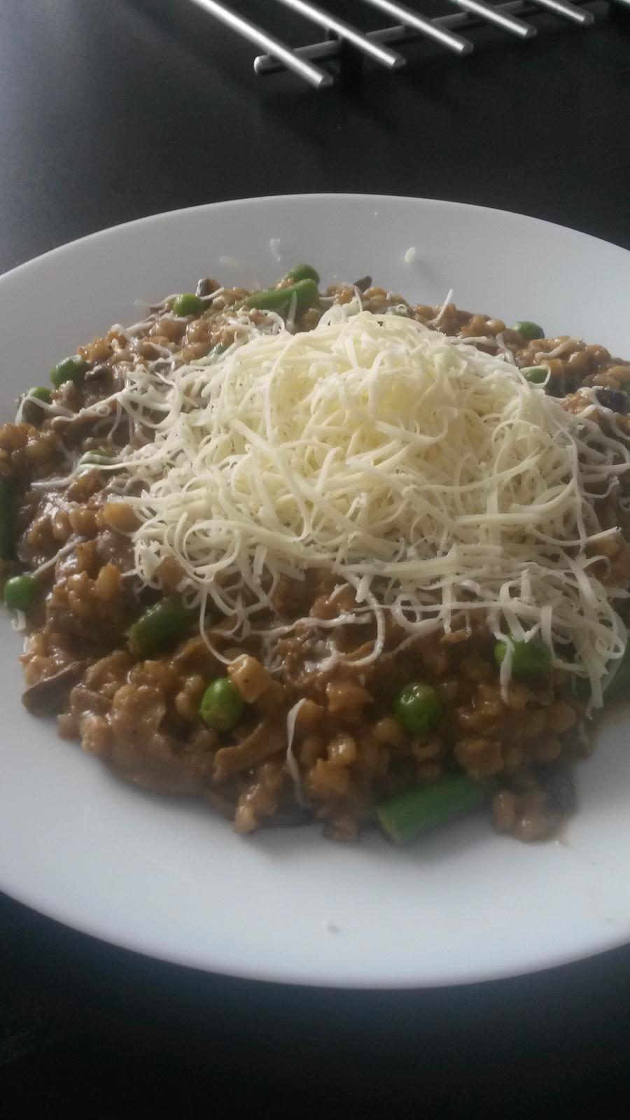 Uvaris krupy v slanej vode. To je cca hodina. Potom si na masle opecies cibulku s cesnakom hodis sampinony a susene huby /ja som nemala sampinony tak som dala len susene/ nato das uvarene krupy podlejes troskou bieleho vina podusis a ku koncu varenia pridas zeleninu ja som dala hrasok a zelene lusky. Lyzicku horcice a nakoniec maslo na zjemnenie chute. 😉