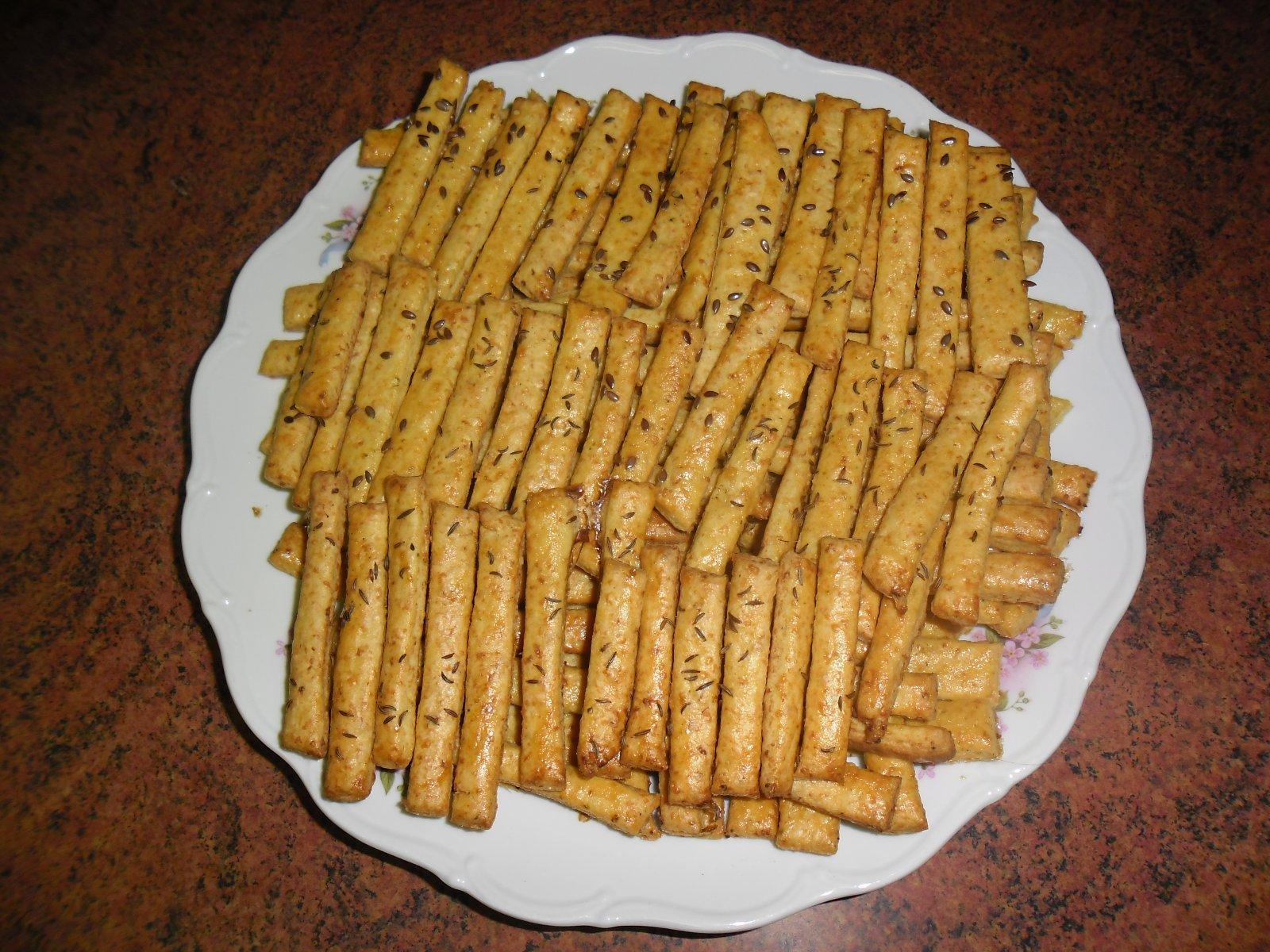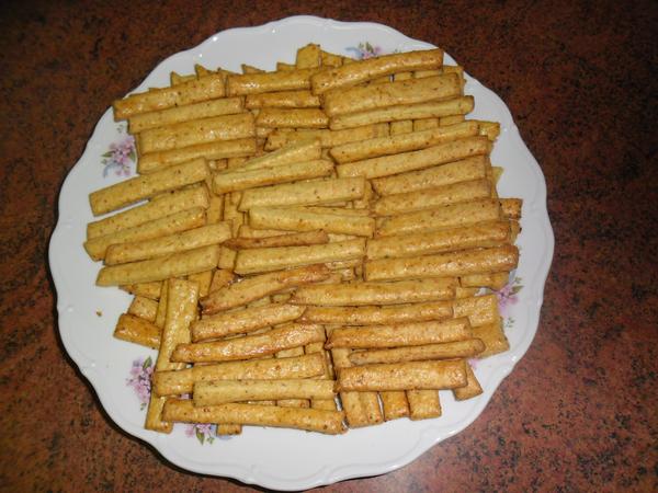 Ze všech surovin vypracujeme těsto, vyválíme ho na asi 3 mm, nakrájíme z něho tyčinky.