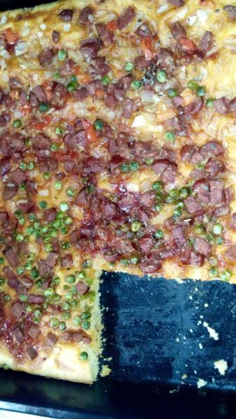 Dnes domaca pizza s kysnuteho cesta .potrela olejom,kecupom cesto.Navrch dala cibulku.klobaska.mrazeny hrasok .